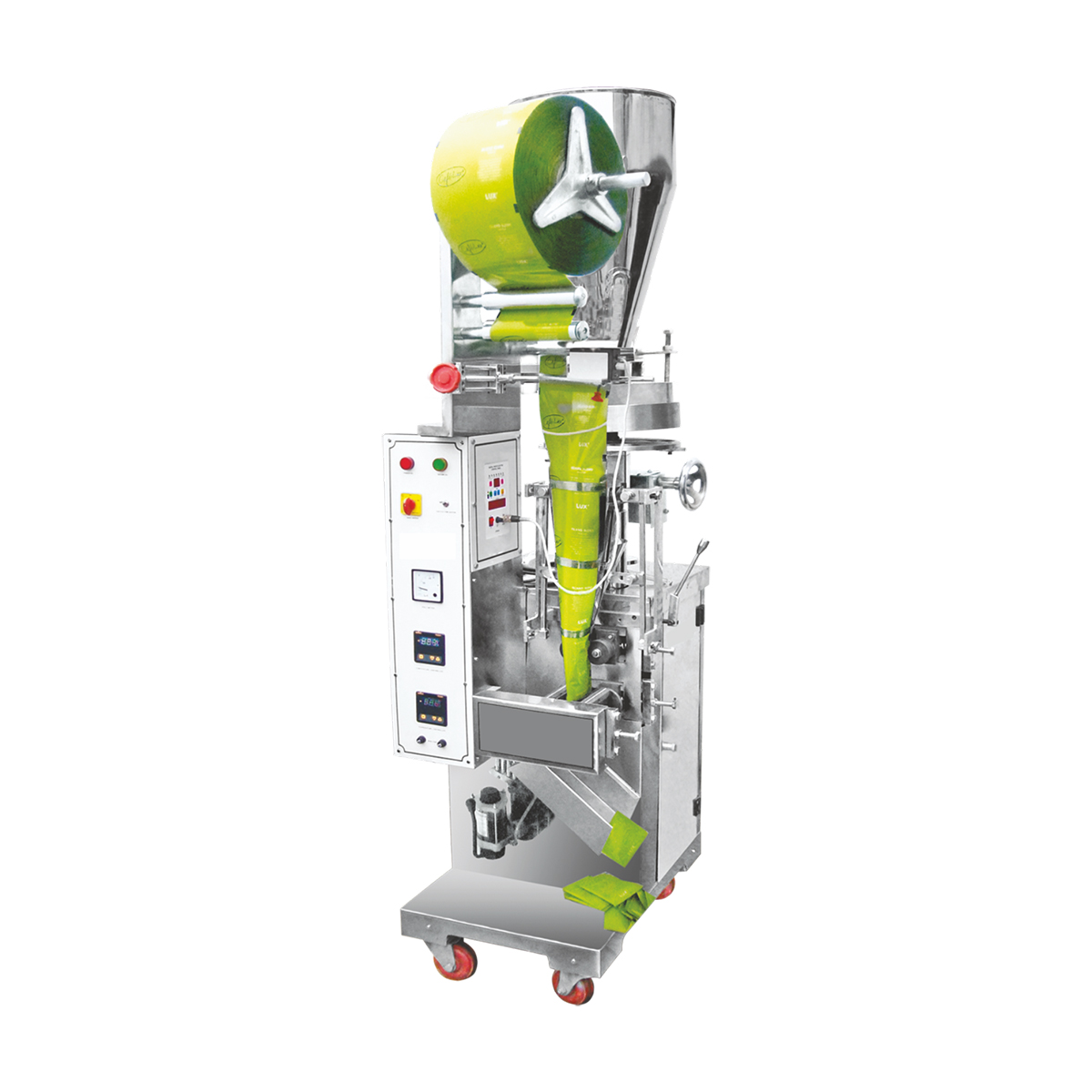 A Fully Pneumatic Form-Fill-Seal (FFS) Cup Filler machine automatically forms a pouch, fills it with a predetermined amount of product, and seals it, all in a single operation. This machine is specifically designed for packaging products in cups or pouches, using pneumatic systems to control the filling and sealing processes. It’s commonly used for edibles, and other goods requiring efficient and precise packaging.